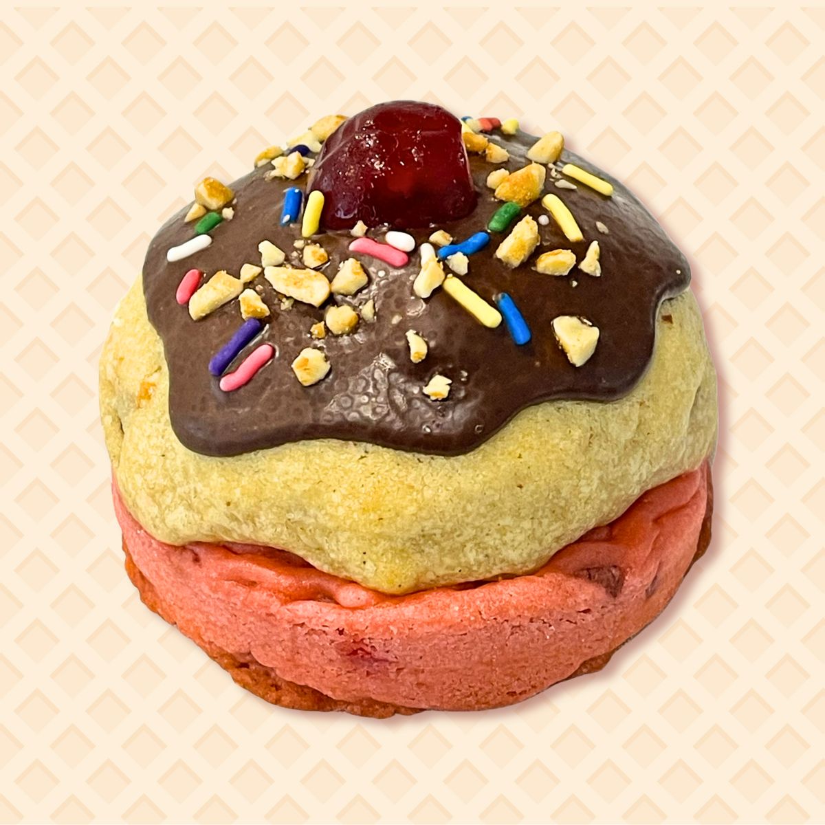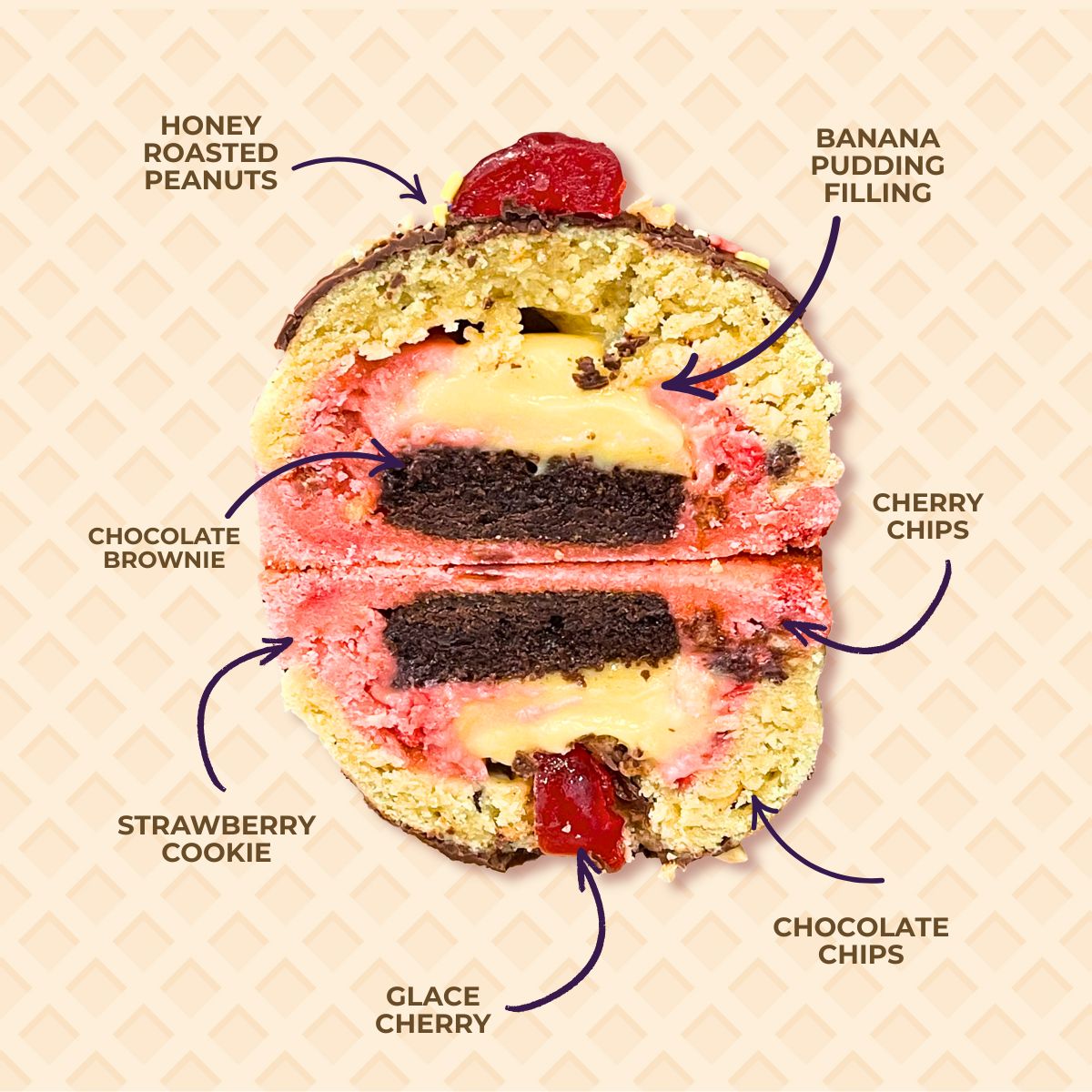 A whimsical spin on the banana split sundae—half vanilla-peanut dough, half strawberry-cherry dough, hugging a decadent brownie and creamy banana pudding core, then finished with a cascade of chocolate, roasted peanuts, and cherry chips.