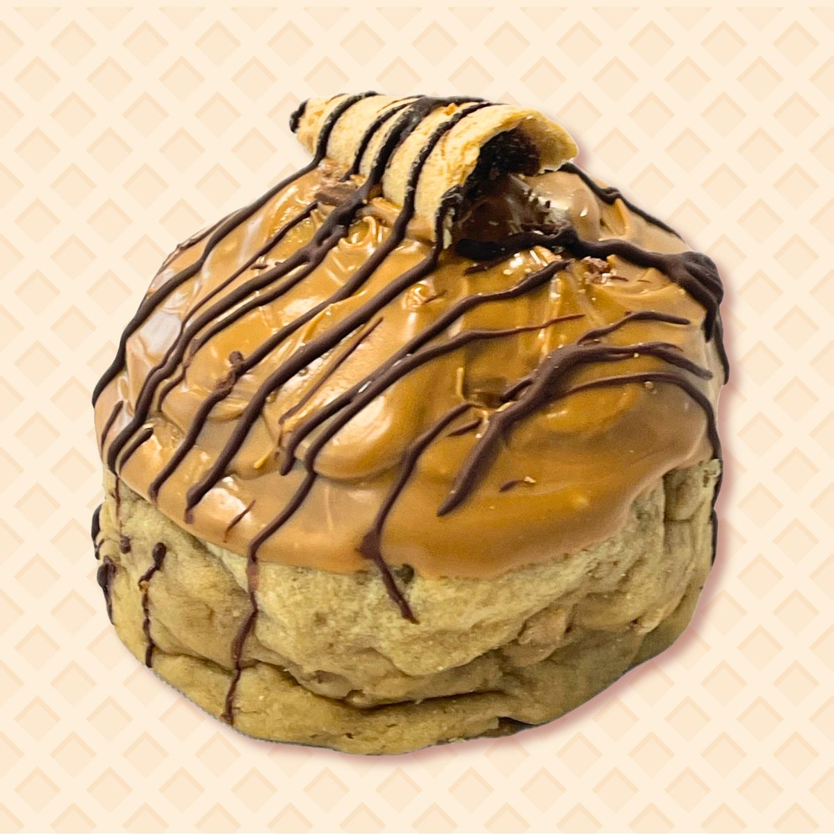 A chewy cookie crammed with candy-shop treasures—crisp Twix chunks, peanut-buttery Butterfinger bits, and caramel-crunch Heath pieces—all tangled up with chocolate-filled waffle cone bites. At the center waits a gooey brownie cheesecake core swirled with dulce de leche, while the top glistens with white chocolate drizzle and crushed waffle cones. It’s equal parts candy bar aisle, ice cream shop, and bakery—stuffed into one outrageous cookie.