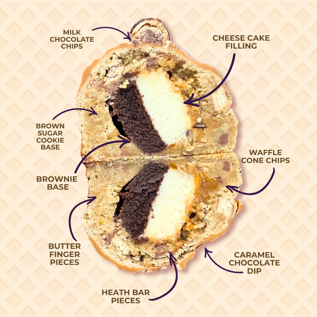 Key Ingredients: Butter, Brown Sugar, Brownie, Eggs, Vanilla, Buttercream, Waffle Cone, Caramel, Twix, Butterfinger, Heath Toffee