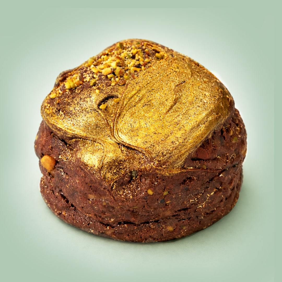 A rich chocolate cookie loaded with milk chocolate chips and roasted pistachio pieces, stuffed with a creamy pistachio crème and crispy kataifi core. Finished simply with a touch of edible gold for a luxe over a melted milk chocolate dip, indulgent finish that lets the flavors do the talking.