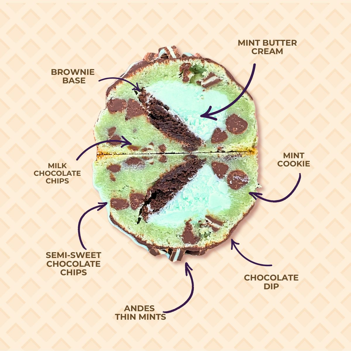 Cool mint-green dough packed with chocolate chips, stuffed with a fudgy brownie and creamy mint buttercream core. Like biting into a scoop of mint chip ice cream with a brownie swirl, only better.