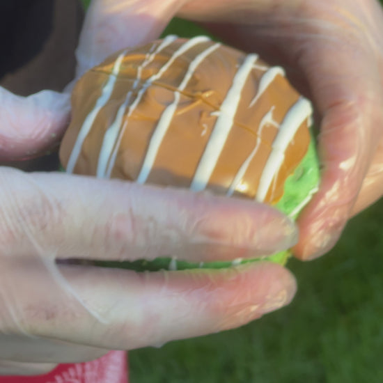 A buttery green caramel apple cookie packed with caramel, white chocolate, and toffee. Inside: a dulce de leche drizzle, green apple buttercream, and a crisp Biscoff cookie base. A gooey, wickedly sweet fall bite.