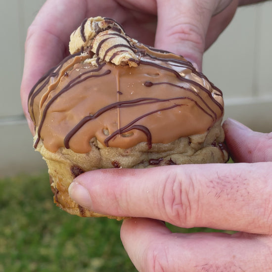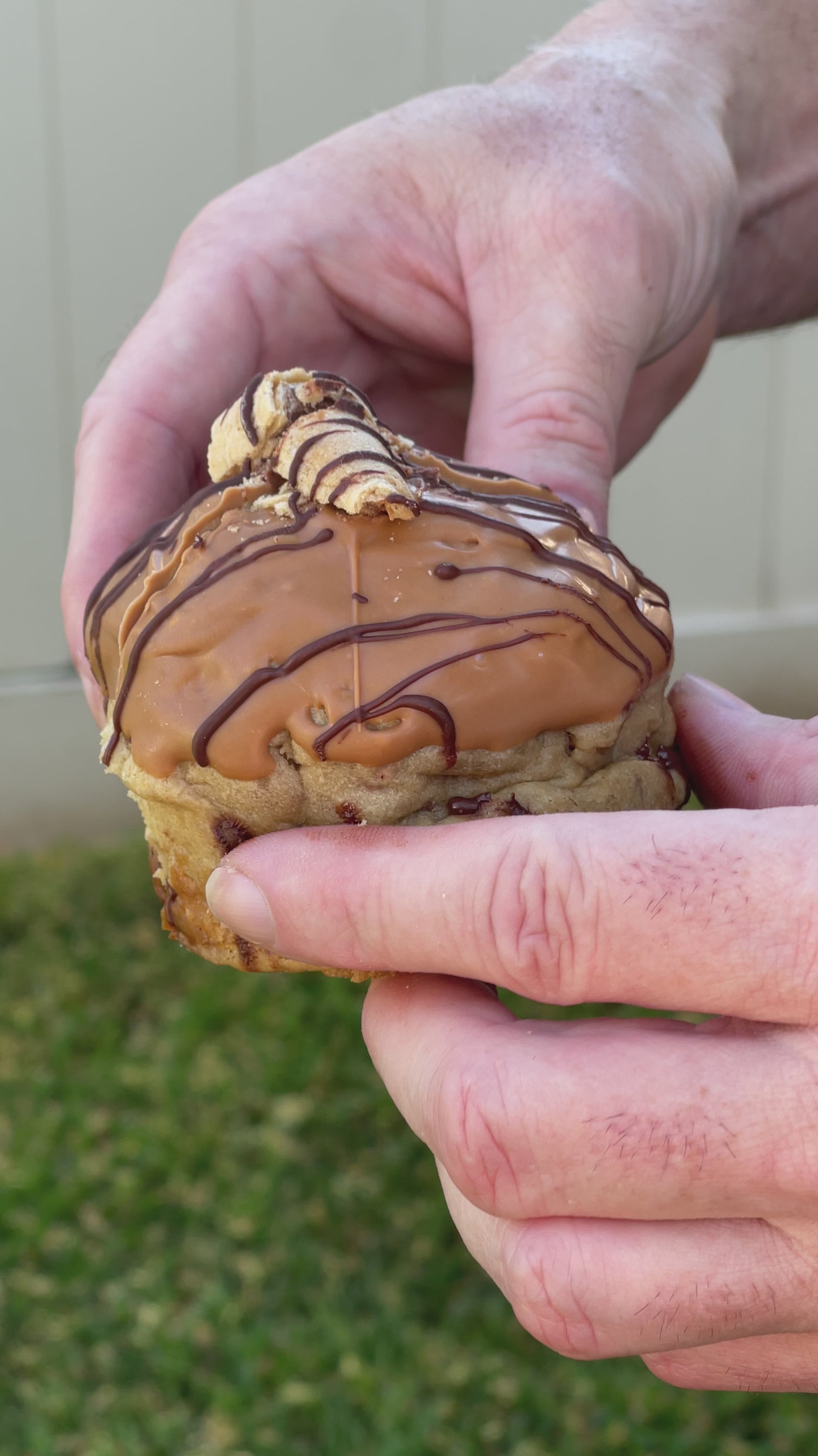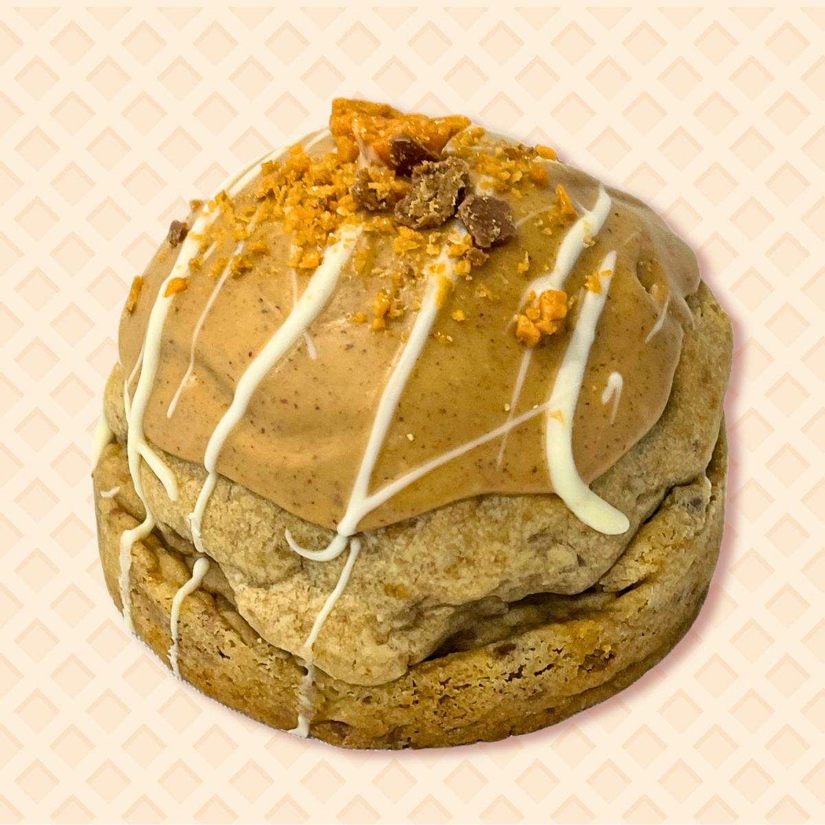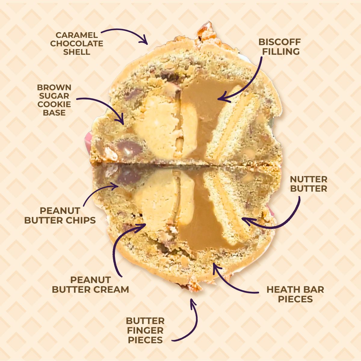This cookie starts with a thick vanilla base packed with Butterfinger crunch, Heath bar toffee, and mini peanut butter chips. At its center is a rich truffle core of Nutter Butter, Biscoff cookie butter, and creamy peanut butter. It’s all finished with a crisp Nutter Butter cookie topper, doubling down on the peanut butter punch in every bite.