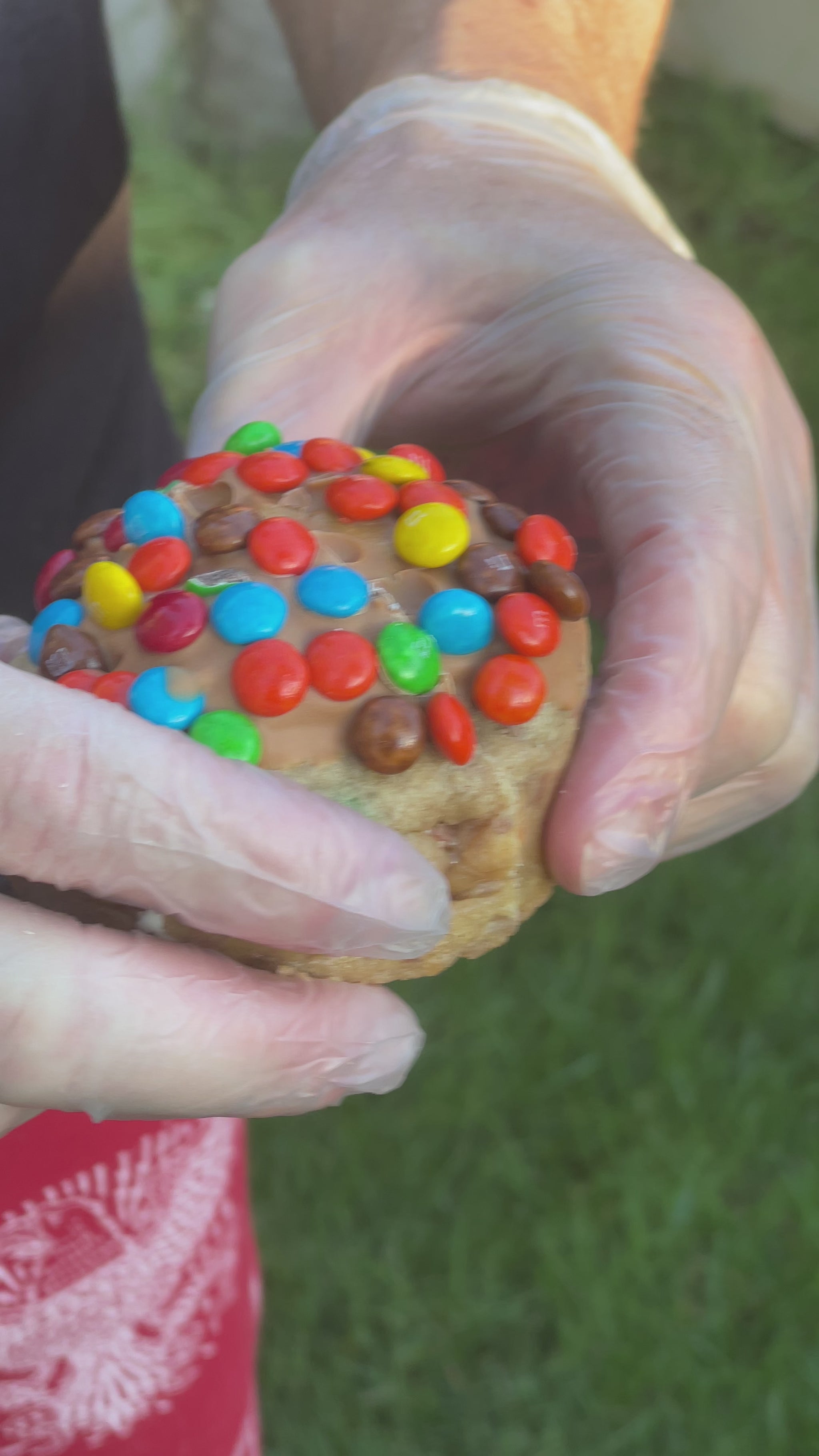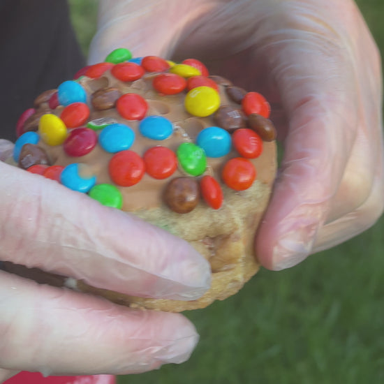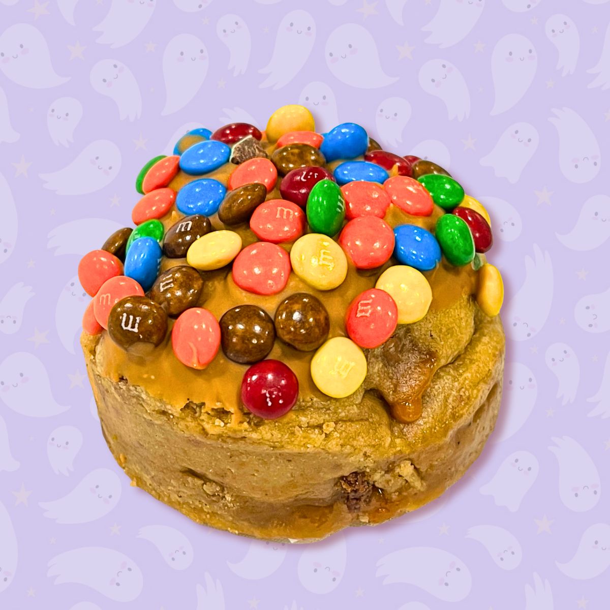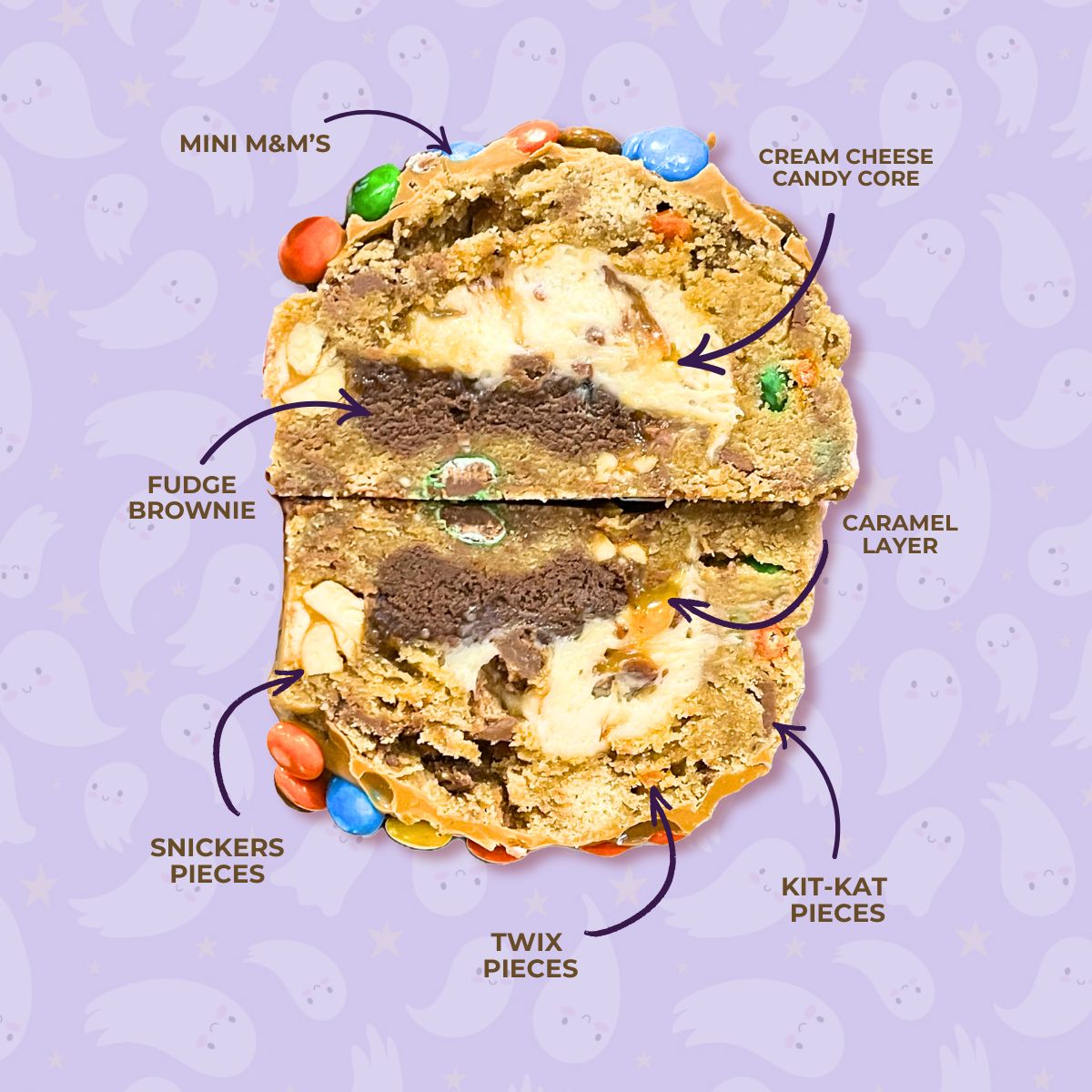 Dark brown sugar cookie dough filled to the brim with halloween candy. Stuffed with brownie, cream cheese and candy bits bomb, and sticky caramel.