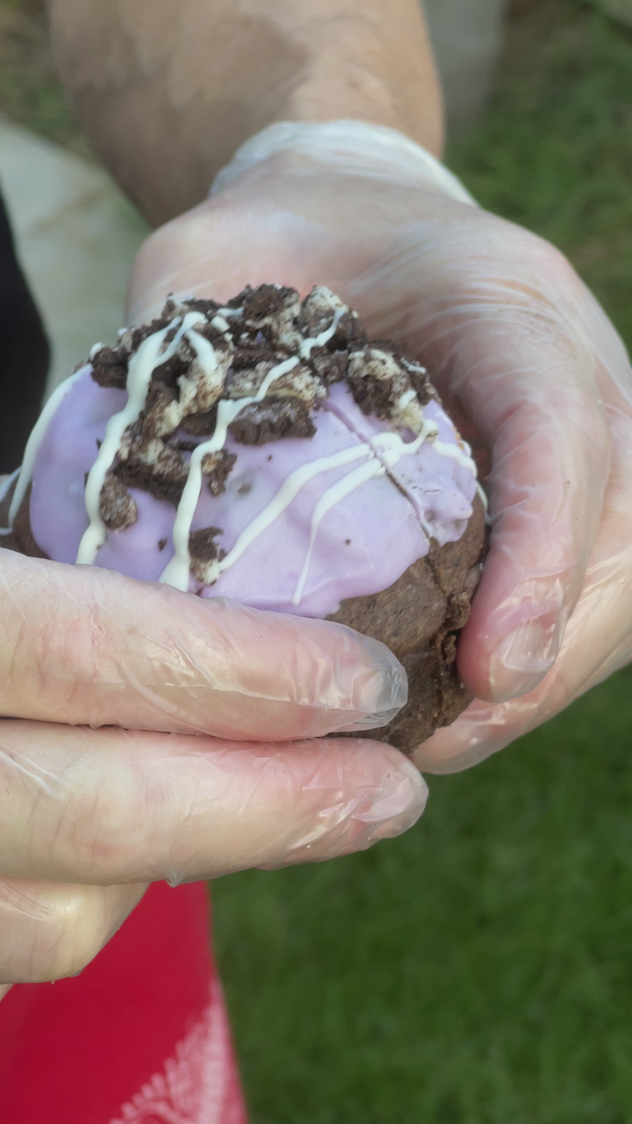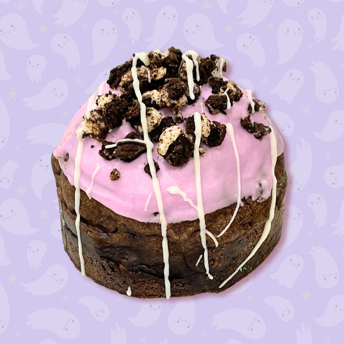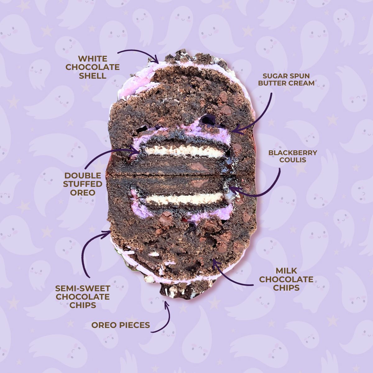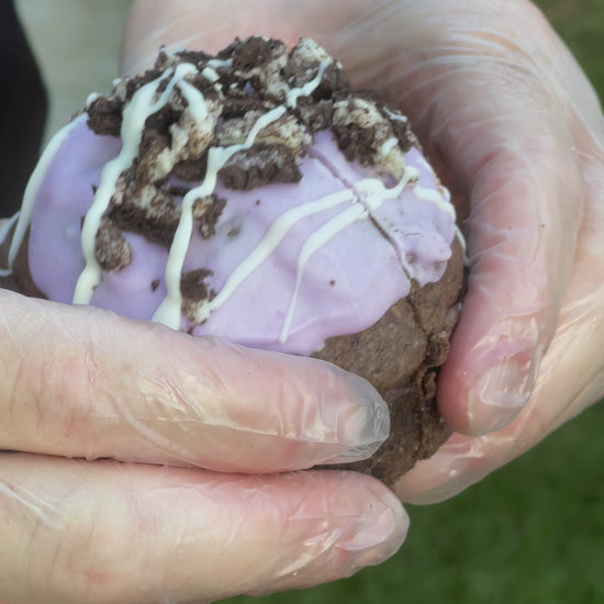 A broodingly rich triple chocolate cookie with crushed Oreos folded into dark cocoa dough. Inside, a moody blackberry coulis and purple cotton candy buttercream center rest on a Double Stuffed Oreo base. Finished with a dark chocolate dip and Oreo crumble — decadent, dark, and deliciously dramatic.
